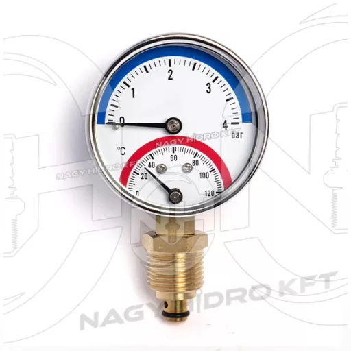 0-4 BAR 0-120Cˇ, MANOMÉTER/NYOMÁSMÉRŐ ÓRA HŐMÉRŐVEL, 63mm ALSÓ 1/4" KIVEZETÉSSEL